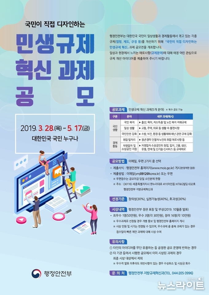 공모 분야는 ▸출산, 육아, 저소득층, 장애인 및 노인복지 저해규제 ▸교통, 주택, 의료 등 생활 속 불편사항 ▸소방, 보건, 환경 등 생활재해 관련 규제 강화 ▸자영업자·소상공인의 창업, 입지, 고용, 생산, 유통, 판매 및 신기술·신서비스 등 규제애로 ▸청년·경력 단절자∙노인의 취업 애로사항 등 5개 분야의 민생규제 혁신 과제이다.