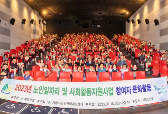 【뉴스라이트 = 한경준 기자】 인천광역시 계양구는 9월 18일부터 20일까지 3일간 노인일자리 및 사회활동지원사업 참여 어르신들을 위한 문화활동으로 CGV계양에서 영화관람 행사를 진행했다.