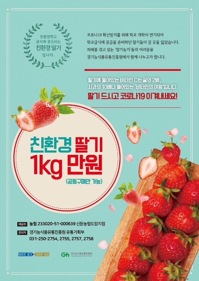 김충범 경기도 농정해양국장은 “코로나19의 영향으로 어려움을 겪는 도내 농민들에게 도움을 주고자 친환경 딸기 팔아주기 행사를 개최하게 됐다”며, “농가의 어려움이 조금이나마 해소되길 바란다”고 말했다.