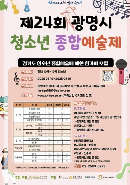 【뉴스라이트 = 이양지 기자】 광명시가 오는 19일부터 6월 1일까지 예술적 재능을 지닌 청소년을 대상으로 ‘2025년 광명시 청소년 종합예술제’ 참가자를 모집한다.