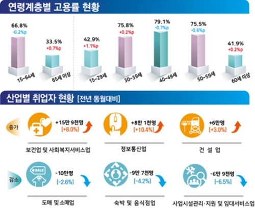 산업별로는 보건업 및 사회복지서비스업, 정보통신업 등에서 늘었고 도매 및 소매업, 숙박 및 음식점업, 제조업 등에서 줄었다.