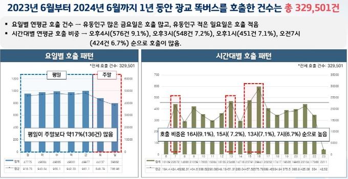 분석 결과, 작년 6월부터 올해 6월까지 1년간 호출 건수는 약 33만 건이며, 연평균 평일 944건으로 주말 808건 대비 17% 많이 호출되는 것이 확인됐다.