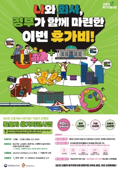 ‘근로자 휴가 지원 사업’은 기업 내 자유롭게 휴가 가는 분위기를 조성하고, 근로자들의 국내 여행을 활성화하고자 추진하고 있는 사업이다. 근로자가 20만 원을 적립하면 근로자 소속 기업과 정부가 각각 10만 원을 추가로 적립해 총 40만 원을 국내 여행 경비로 사용할 수 있도록 지원한다.