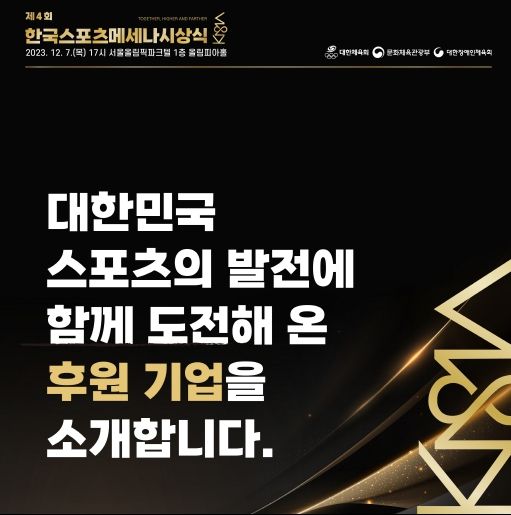 【뉴스라이트 = 이세현 기자】 문화체육관광부는 대한체육회(회장 이기흥), 대한장애인체육회(회장 정진완)와 함께 12월 7일 오후 5시, 서울 올림픽파크텔에서 ‘제4회 한국 스포츠메세나 시상식’을 열고 후원사 6개사에 상을 수여한다.