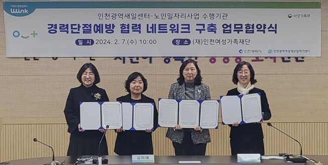 【뉴스라이트 = 이세현 기자】 인천광역새일센터와 남동시니어클럽, 부평구노인인력개발센터, 서구노인인력개발센터는 2024년 2월 7일 (재)인천여성가족재단에서 경력단절예방 협력 네트워크 구축 업무협약을 체결했다.