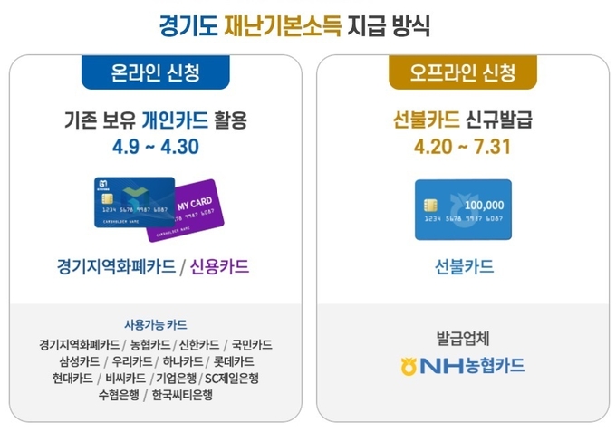 9일부터 이달 30일까지는 기존에 갖고 있던 경기지역화폐카드나 신용카드로 지급받을 도민들만 신청할 수 있다. 선불카드 방식은 오는 20일부터 신청 가능하다.