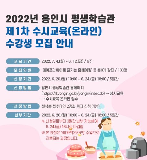 용인시 평생학습관 홈페이지에서 신청이 가능하며, 선착순으로 수강생을 선발한다.