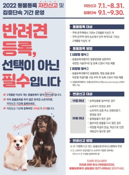 동물등록 자진신고 기간 이후 9월 1일부터 공원, 산책로 등 반려견이 자주 이용하는 장소에서 동물등록 여부 및 반려동물 안전조치(인식표·목줄 미착용) 집중 단속에 나설 예정이다.
