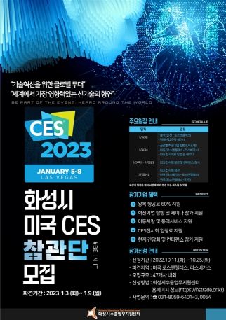 【뉴스라이트 = 조용은 기자】 화성시가 내년 1월 미국 라스베이거스에서 열리는 세계 최대 가전제품 박람회인 ‘CES 2023’참관단을 모집한다.
