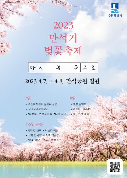 【뉴스라이트 = 조용은 기자】 수원시를 대표하는 봄꽃 축제 ‘2023 만석거 벚꽃 축제’가 4월 7~8일 장안구 만석공원에서 열린다.
