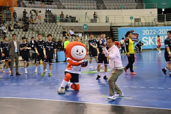 【뉴스라이트 = 김정민 기자】 이현재 하남시장이 1일 서울 송파구 SK 핸드볼경기장에서 열린 2022-2023 SK핸드볼 코리아리그 남자부 플레이오프(PO) 1차전에 참석해 하남시청 남자핸드볼 선수단을 격려했다.