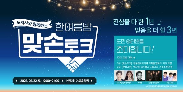 【뉴스라이트 = 조용은 기자】 김동연 경기도지사가 7월 22일 오후 7시 수원제1야외음악당에서 민선 8기 2년차를 맞아 ‘한여름밤 맞손토크’를 열고 도민과 만난다.
