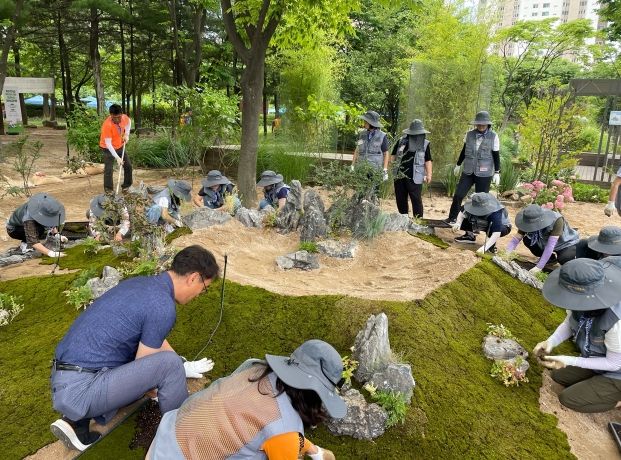 이날 조성한 탄소흡수원은 탄소꽃이끼, 털깃털이끼 등 6종의 이끼와 화관목, 경관석 등을 활용해 한라산을 형상화한 이끼 생태정원으로 구성됐다. ‘2023년 부천 시민정원사 양성교육’ 수강생들이 그간 배운 이론을 바탕으로 현장에서 직접 조성해 의미를 더했다.
