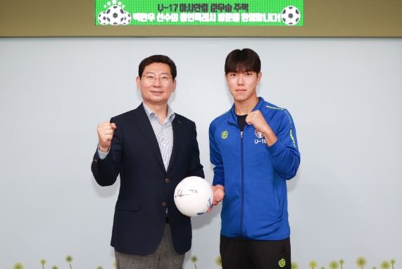 이상일 용인특례시장은 “백인우 선수가 우즈베키스탄과 준결승에서 보여준 프리킥은 환상적이었다”며 “오는 11월 인도네시아에서 열리는 ‘U-17 월드컵’에 참가해 변함없는 활약을 펼쳐 대한민국과 용인특례시의 위상을 높여달라”고 당부했다.