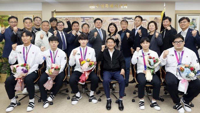 이날 환영식에는 김기정 의장을 비롯한 강영우·유준숙·조미옥·조문경·정영모·박현수·정종윤·이재형 위원장과 선수단 및 지도자 등이 참석해 담소를 나눴다.
