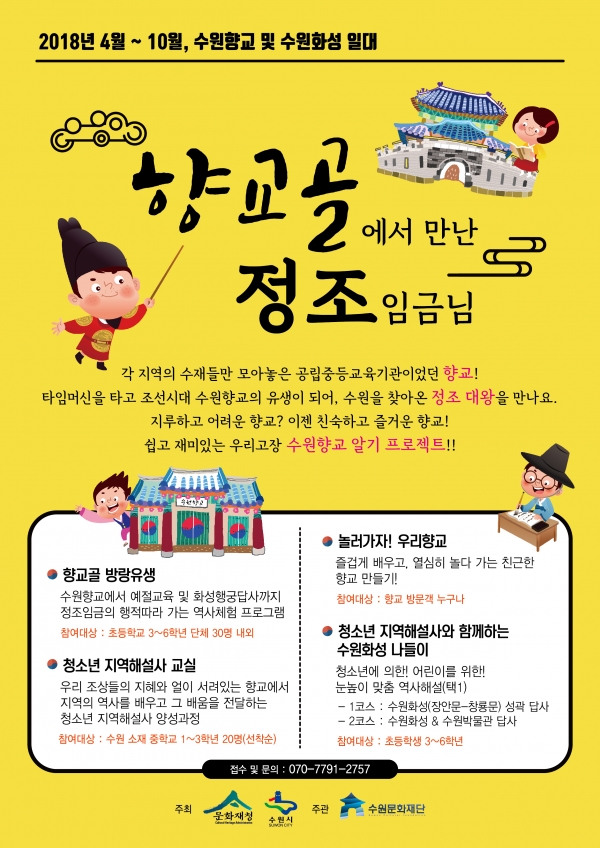【뉴스라이트】 수원문화재단(대표이사 박흥식)은 ‘2018년 살아 숨 쉬는 향교?서원 문화재 활용사업’인 <향교골에서 만난 정조임금님>을 수원향교 및 수원화성 일대에서 10월까지 진행한다.