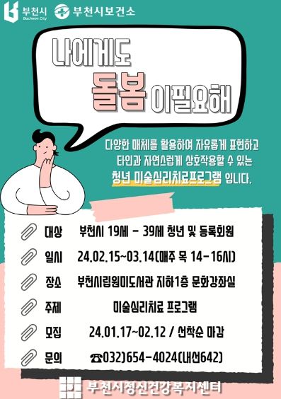 【뉴스라이트 = 이세현 기자】 부천시 및 부천시정신건강복지센터는 부천시 청년들의 사회적 기술 향상과 정신건강 증진을 목표로 오는 2월 15일부터 3월 14일까지 청년 미술심리치료프로그램 ‘나에게도 돌봄이 필요해’를 운영한다.