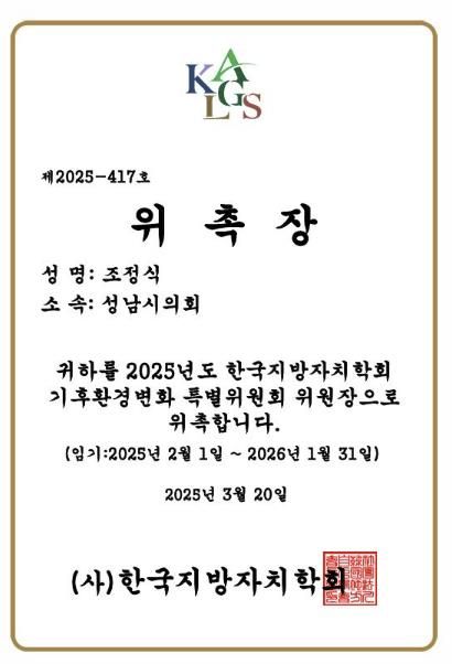 조정식 의원은 성남시의회에서 활발한 의정활동을 펼치며 환경정책과 지속가능한 발전에 대한 높은 관심과 전문성을 보여왔다. 이번 위촉을 통해 조 의원은 한국지방자치학회의 회원들과 지방의원들과의 교류를 통하여 기후변화 대응과 환경 정책 발전을 위한 다양한 연구와 정책 개발을 주도할 예정이다.