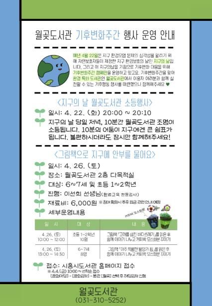 이어, 4월 26일에는 어린이 대상 환경 독서프로그램인 ’그림책으로 지구에 안부를 물어요‘가 월곶도서관 2층 다목적실에서 진행된다. 프로그램은 6ㆍ7세 및 초등 1ㆍ2학년 어린이를 대상으로 하며, 환경 관련 그림책을 함께 읽고 커피박을 활용한 모스화분 꾸미기를 통해 아이들이 환경 보호의 중요성을 배우고 실천할 수 있도록 돕는다.