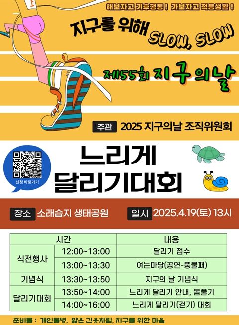 지구의 날 조직위원회는 가톨릭환경연대를 비롯한 11개 환경단체로 구성됐으며, 오는 4월 19일 인천 소래습지 생태학습관에서 ‘지구를 위해 SLOW, SLOW’를 주제로 느리게 달리기 대회를 개최한다. 이를 통해 기후위기에 대한 시민인식을 제고하고 탄소중립 기후 행동을 확산할 계획이다.