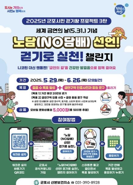 김미경 군포시보건소장은 “이번 챌린지를 통해 시민들이 지역 내 금연 환경에 대한 관심을 갖고, 걷기와 금연을 일상 속에서 함께 실천하는 계기가 되길 바란다”며 “건강한 생활습관을 형성함과 동시에, 금연의 중요성을 다시 한번 되새기는 뜻깊은 시간이 되기를 기대한다”고 전했다.
