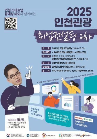 【뉴스라이트 = 이세현 기자】 인천광역시와 인천관광공사(사장 백현)는 오는 9월 23일 인천시청 본관 2층 대회의실에서 관광 분야 구직자의 취업 경쟁력 강화를 위한‘2025 인천관광 취업컨설팅(2차)’을 진행한다고 밝혔다.