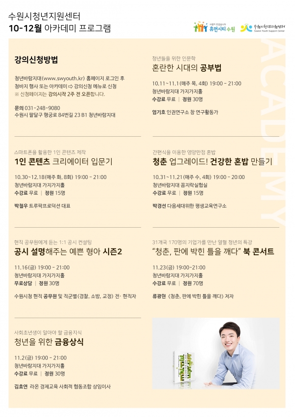 수원시청년지원센터가 청년들의 자기 계발과 문화 활동 지원을 위해 운영하는 수원청년아카데미 4분기 강좌가 10월 개강한다.