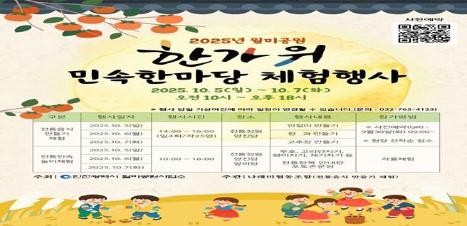 【뉴스라이트 = 이세현 기자】 인천광역시 월미공원사업소는 오는 10월 5일부터 7일까지 3일간 월미공원 내 전통정원(양진당)에서 ‘한가위 민속한마당 체험행사’를 개최한다고 밝혔다.