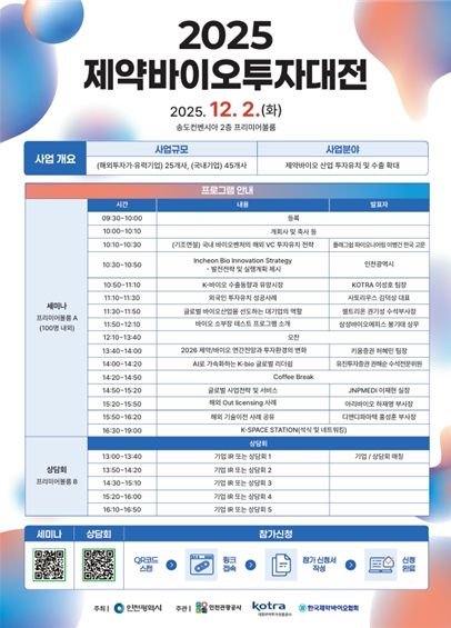 【뉴스라이트 = 이세현 기자】 인천광역시가 주최하고 인천관광공사와 KOTRA, 한국제약바이오협회가 공동 주관하는 ‘제약바이오투자대전’이 오는 12월 2일 인천 송도컨벤시아 프리미어볼룸에서 열린다.