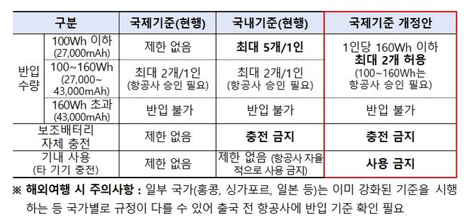 기존 국제기준에서는 일반인이 가장 많이 사용하는 100Wh(27,000mAh) 이하 보조배터리에 대한 반입 수량 제한이 없어, 국내 기준을 마련하여 1인당 5개까지 제한했으나, 앞으로는 신설된 국제기준에 따라 보조배터리(Power bank)는 1인당 최대 2개(160Wh/43,000mAh 이하)로 반입이 제한된다.