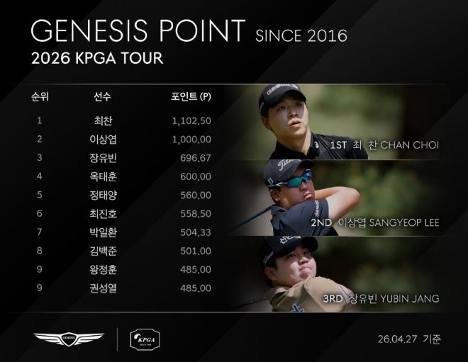 최찬은 ‘2026 우리금융챔피언십’에서 최종합계 13언더파 271타로 우승해 제네시스 포인트 1,000 포인트를 추가한 1,102.50 포인트로 단숨에 제네시스 포인트 1위에 올라섰다. 최찬이 제네시스 포인트 1위에 위치한 것은 2022년 투어 입성 이후 최초다.