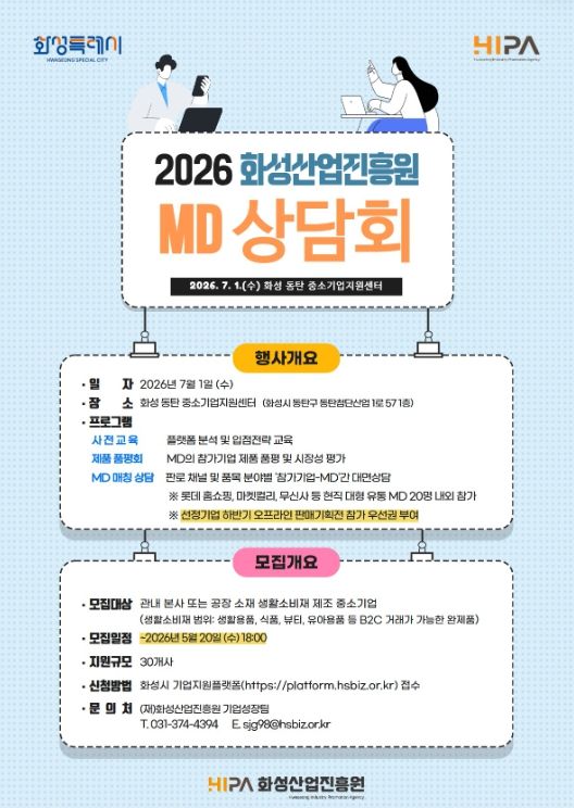 【뉴스라이트 = 조용은 기자】 화성산업진흥원(원장 전병선)은 화성시 생활소비재 기업의 대형 유통망 진입과 신규 판매채널 확보를 지원하기 위해 ‘2026년 화성산업진흥원 MD 상담회’를 개최하고, 오는 5월 20일까지 참여기업을 모집한다.