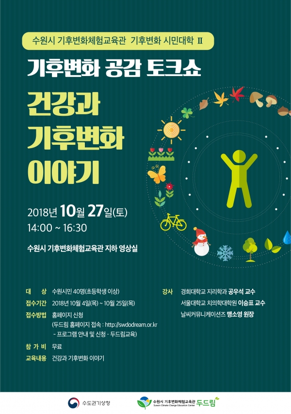 수원시기후변화체험교육관 ‘두드림’과 수도권기상청은 27일 오후 2시 기후변화체험교육관 지하 영상실에서 시민과 함께하는 공감 토크쇼 ‘건강과 기후변화 이야기’를 연다.