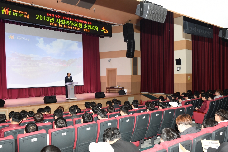 수원시는 24일 수원시청 대강당에서 수원시 소속 사회복무요원 500여 명을 대상으로 소양 교육을 했다.