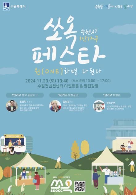 【뉴스라이트 = 조용은 기자】 수원시가 23일 모든 연령대를 아우르는 1인 가구 축제 ‘수원시 1인 가구 쏘옥(SsOcC) 페스타’를 개최한다.