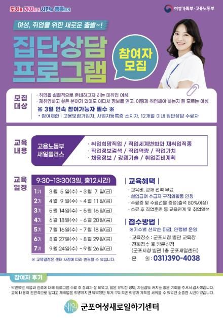 【뉴스라이트 = 이양지 기자】 군포시 ‘군포여성새로일하기센터’에서는 취업을 희망하는 여성들을 대상으로 맞춤형 집단상담프로그램인 ‘고용노동부 새일플러스’ 과정 참여자를 모집한다.