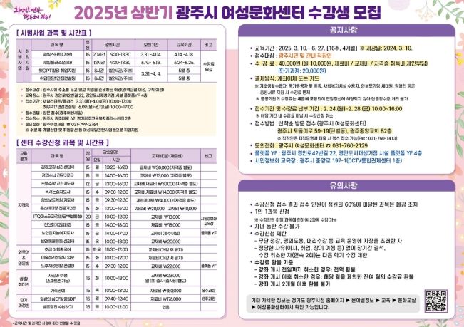 【뉴스라이트 = 김정민 기자】 광주시 여성문화센터는 오는 28일까지 ‘2025년 상반기 여성문화센터 프로그램’ 수강생을 모집한다.