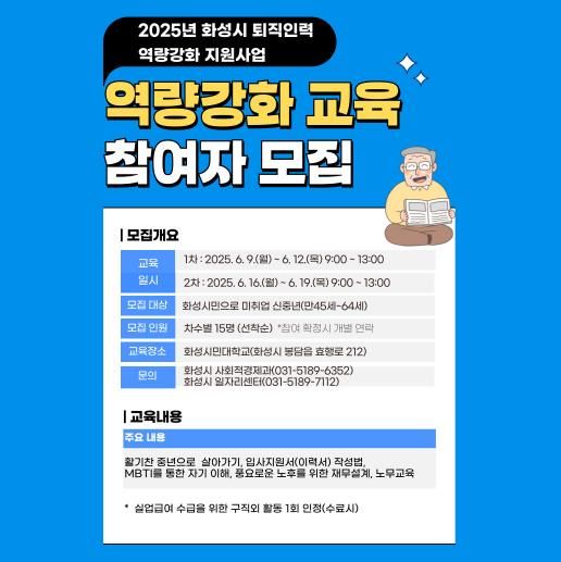 【뉴스라이트 = 조용은 기자】 화성특례시가 퇴직 인력의 사회 재진출과 노후 준비를 돕기 위한 ‘2025년 퇴직인력 역량강화 교육’ 참여자를 모집한다.