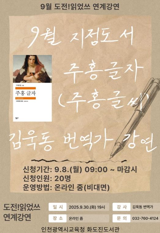 【뉴스라이트 = 이세현 기자】 인천광역시교육청화도진도서관은 9월 ‘독서의 달’을 맞아 오는 9월 30일 저녁 7시부터 9시까지 ‘도전! 읽었쓰’ 연계 강연 ‘주홍글자(주홍글씨)의 이해’를 비대면으로 운영한다.