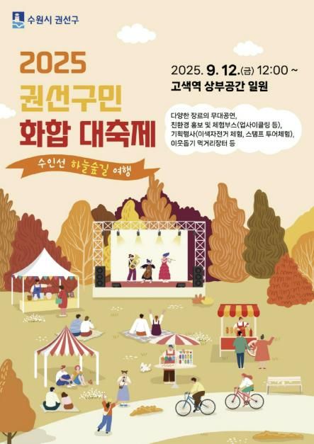 【뉴스라이트 = 조용은 기자】 수원시 권선구는 오는 12일에 '2025 권선구민 화합 대축제' ‘수인선 하늘숲길 여행’ 축제를 고색역 상부공간 일원에서 개최한다.