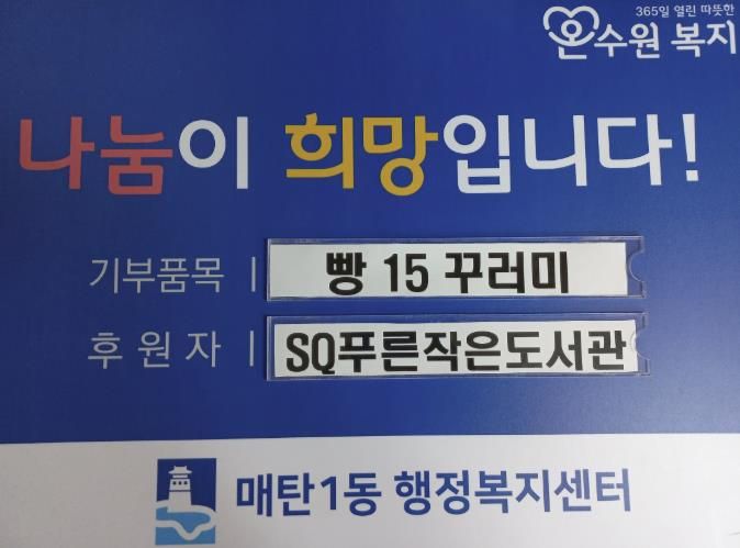 김은정 매탄1동장은 "SQ푸른작은도서관의 따뜻한 정기후원은 우리 지역사회에 큰 힘이 되고 있다. 필요한 이웃들에게 전해지는 이 빵 꾸러미가 작은 위로가 되어, 모두가 함께 살아가는 공동체의 의미를 다시금 생각하게 한다”며 감사의 뜻을 전했다.