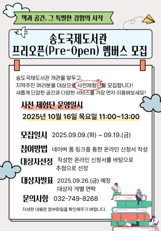 체험단 신청은 9월 9일부터 19일까지 연수구립도서관 누리집을 통해 ‘네이버 폼’으로 신청할 수 있으며, 신청자 중 추첨을 통해 100명 내외의 최종 체험단이 선정될 예정이다.