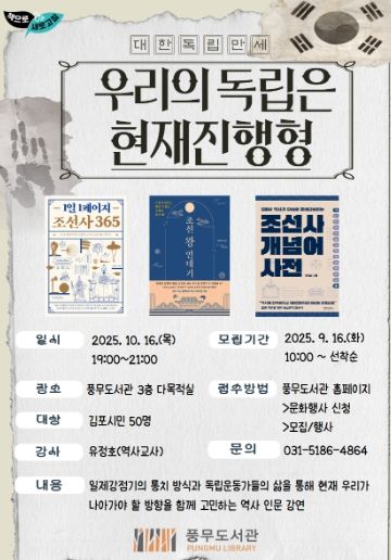‘우리의 독립은 현재진행형’은 한국표준분류법(KDC) 900번대 역사 분야를 테마로 한 2025년 풍무도서관 다섯 번째 달밤인문학인 동시에 2025 대한민국 독서대전 연중 프로그램의 일환으로 운영된다.