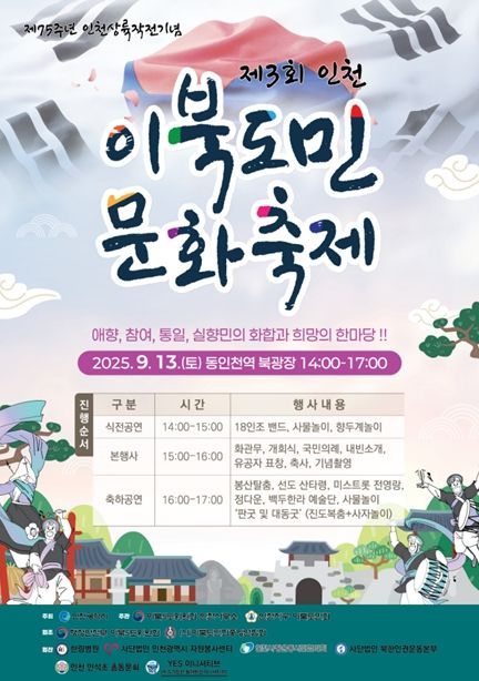 【뉴스라이트 = 이세현 기자】 인천광역시는 9월 13일 동구 송현동 동인천역 북광장에서 2025 인천 이북도민 문화축제를 개최한다. 세 번째로 열리는 이번 축제는 이북도민의 문화를 홍보‧계승하고 실향민과 이산의 아픔을 위로하며 이북도민들의 사기를 높이기 위해 마련됐다.