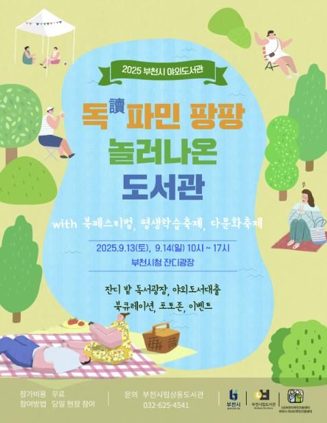 【뉴스라이트 = 이세현 기자】 부천시는 책과 자연 속 휴식을 함께 누릴 수 있는 ‘놀러나온 도서관’ 행사를 9월 13일과 14일, 양일간 오전 10시부터 오후 5시까지 부천시청 잔디광장에서 개최한다. 이번 행사는 ‘독讀파민 팡팡, 놀러나온 도서관’을 주제로 시민들이 일상에서 독서를 더욱 친근하게 접할 수 있도록 마련됐다.