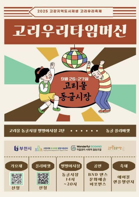 【뉴스라이트 = 이세현 기자】 부천시는 9월 26일부터 27일까지 이틀간 오정구 고리울 동굴시장에서 ‘2025 고리우리축제’를 연다고 23일 밝혔다. 이번 행사는 부천시 원도심재생과가 주최하고 원더풀고강마을관리 사회적협동조합이 주관한다.