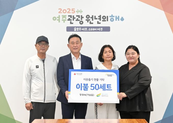 【뉴스라이트 = 김정민 기자】 지난 19일 장경숙(가남읍 주민)님은 여주시청을 방문하여 여주시 저소득층을 돕기 위한 후원품으로 이불 50세트(175만원 상당)를 기탁했다.