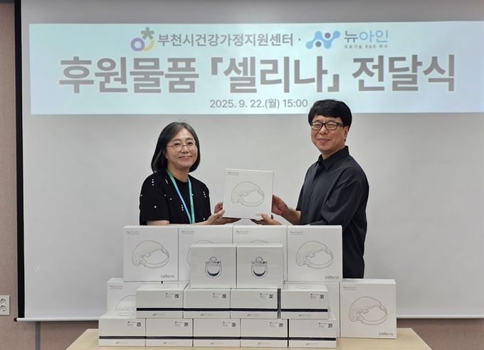 【뉴스라이트 = 이세현 기자】 부천시건강가정지원센터는 헬스테크 스타트업 ㈜뉴아인으로부터 건강보조기기(위드녹스, 셀리나 등)를 후원받아 지역사회 가정에 실질적인 지원을 이어가게 됐다.