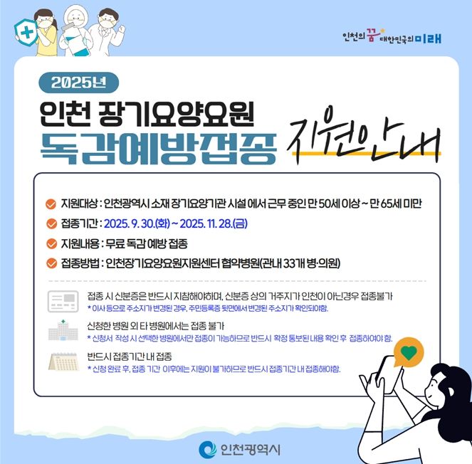 【뉴스라이트 = 이세현 기자】 인천광역시는 노인 감염취약시설인 장기요양기관 종사자 1만여 명의 건강권 확보와 처우 개선을 위해 오는 9월 30일부터 11월 28일까지 약 9주간 무료 독감 예방접종을 실시한다고 밝혔다.