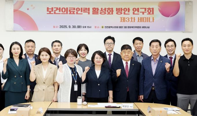 【뉴스라이트 = 이세현 기자】 인천광역시의회 의원연구단체인 ‘보건의료인력 활성화 방안 연구회’는 30일 문화복지위원회 세미나실에서 박판순 대표의원(국·비례)을 비롯해 박창호(국·비례)·이봉락(국·미추홀구3) 의원, ‘의료기사단체 정책연구단’관계자 등이 참석한 가운데 ‘제3차 정책 세미나’를 개최했다.